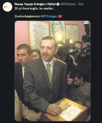 Başkan Recep Tayyip Erdoğan, AK Parti'nin ilk iktidara geldiği 3 Kasım 2002 seçimlerinin yıldönümünde, kendisinin 2181 numaralı sandıkta oy kullanırken çekilen fotoğrafını sosyal medya hesabından "20 yıl önce bugün, bu saatler" mesajıyla paylaştı. Erdoğan, bir diğer sosyal medya paylaşımda da şu ifadeleri kullandı: "3 Kasım 2002 tarihinde başlayan millete hizmet yolculuğumuzda, 20 yıllık kesintisiz iktidarla bir rekora daha imza attık. Evet, tam 20 yıldır Türkiye'ye aşkla hizmet ediyoruz... İnşallah daha nice yıllarımız, daha nice hizmetlerimiz, daha nice rekorlarımız olacak."