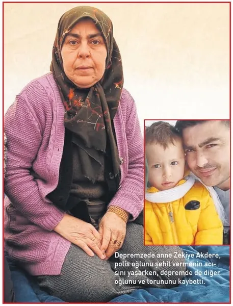 Ama oğlum Remzi ile torunum Hakan Emir (5) hayatlarını kaybetti. Torunuma enkaz başında son bir kez sarıldım. Kucaklayıp onu sardım ve öptüm" dedi. Şehit oğlu Hakan Akdere'nin eşi ve oğlunun Kayseri'de yaşadığı için depremden etkilenmediklerini belirten şehit annesi Zekiye Akdere, "Evlatlarım geride bana bu iki gülü bıraktılar. Koklayıp hayata tutunayım diye" şeklinde konuştu.