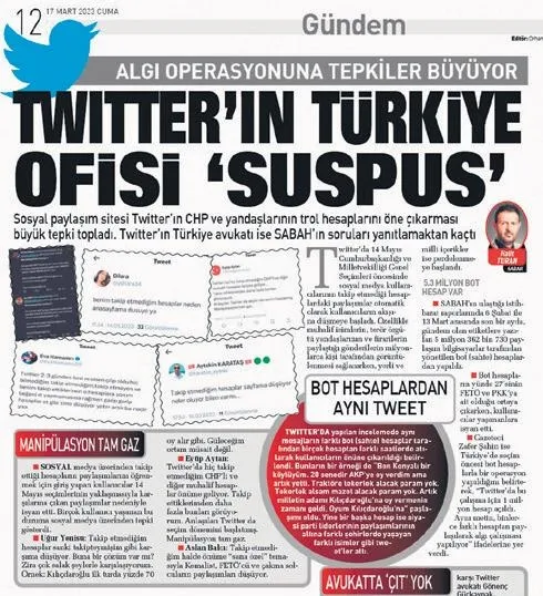 SABAH Gazetesi, Twitter'daki algı operasyonlarının nasıl yapıldığını deşifre etti. İstihbarat raporlarında 6 Şubat ile 13 Mart arasında gündem olan etiketlere yazılan 5 milyon 362 bin 730 paylaşımın bilgisayarlarca yönetilen bot (sahte) hesaplardan yapıldığı, botların yüzde 27'sinin ise FETÖ ve PKK'ya ait hesaplar olduğu ortaya çıktı. Yaşananların, 14 Mayıs Cumhurbaşkanlığı ve Milletvekili Genel Seçimlerinin hemen öncesine denk gelmesi akıllarda soru işaretlerine neden oldu.