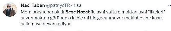 Naci Taban: Meral Akşener, PKK'lı Bese Hozat ile aynı safta olmaktan, aynı 'ilkeleri' savunmaktan görünen o ki hiç mi hiç gocunmuyor. Maklubesine kaşık sallamaya devam ediyor. Meral Hanım oturduğun masa çok kirli...