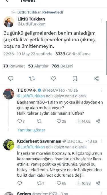 Şehit abisine ve kendisini eleştirenlere küfür ederek tepki toplayan İyi Parti Kocaeli Milletvekili Lütfü Türkkan, bu defa da Millet İttifakı Cumhurbaşkanı Adayı Kemal Kılıçdaroğlu'na 'kazanamayacak' imasında bulundu. Türkkan, Cumhurbaşkanı Recep Tayyip Erdoğan ile Sinan Oğan'ın yaptıkları görüşmenin ardından sosyal medya hesabı üzerinden "Bugünkü gelişmelerden benim anladığım şu; etkili ve yetkili çevreler yoluna çıkmış, boşuna ümitlenmeyin" ifadelerini paylaştı. Bu sözler pek çok kişi tarafından Kılıçdaroğlu'nun seçimi kazanamayacağı iması olarak algılandı. Paylaşımın altına "İyi Parti havlu attı, sahada çalışmayacak anlaşılan" yorumları yapıldı.