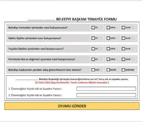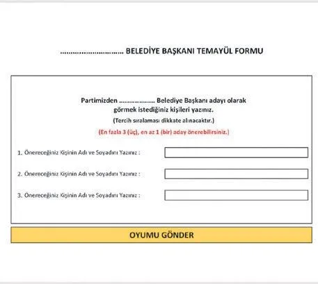Öte yandan formun altında yer alan açık uçlu olarak teşkilattan belediye başkan adayı olarak kimi görmek istediklerini de yazmaları talep edildi.