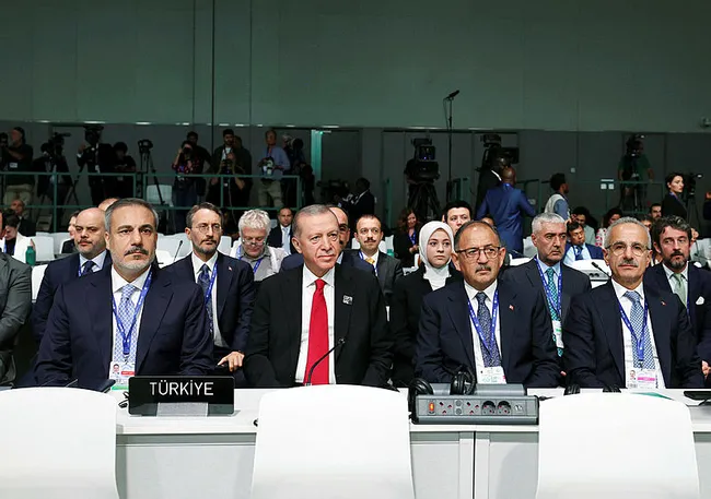 Dünyamız koronavirüs salgını ve Ukrayna-Rusya savaşının ardından şimdi de Gazze'deki katliamların acı sonuçlarıyla karşı karşıya bulunuyor. Türkiye, tüm bu krizlerde barışın yanında olmuş adalet ve hakkaniyet temelinde çözüm için çalışmıştır. İklim değişikliğine de bu perspektiften yaklaşıyoruz. Sera gazı emisyonunda tarihi sorumluluğumuz yüzde 1'in altında olmasına rağmen kendi imkanlarımızı kullanarak çok önemli adımlar atıyoruz. 2053 yılı itibari ile 'Net sıfır emisyon' hedefini gerçekleştirmeyi öngörüyoruz. 2030 senesine kadar emisyon azaltım hedefimizi iki katına çıkardık. Bu kapsamda yıl sonu itibari ile ise 6,6 ton karbondioksit emisyon azaltımı bekliyoruz.