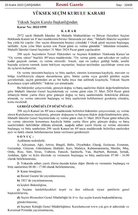 Son dakika...YSK kararı Resmi Gazete'de yayımlandı. Mahalli idareler seçimi 31 Mart 2024 Pazar günü yapılacak.