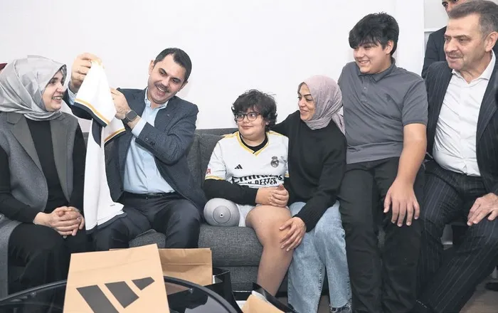 MURAT Kurum, Gaziosmanpaşa'da yaşayan depremzede aileyi de evinde ziyaret etti. 6 Şubat depremlerinin ardından İstanbul'a gelen Hataylı anne Halime Arslan, çocukları Nevrez Emir Arslan (13)ve Osman Efe Arslan (16) ile bir araya gelen Kurum, aileye başsağlığı ve geçmiş olsun dileklerini iletti. Ziyarette depremde hayatını kaybedenler için dua edilirken Kurum, "Deprem bölgesinden elimizi hiç çekmeyeceğiz. 1 Nisan'dan itibaren inşallah depremzedelerin ne ihtiyacı varsa ilgileneceğiz." ifadesini kullandı. Kurum, Nevrez Emir'e Real Madrid forması, Osman Efe'ye de depremde hayatını kaybeden babasının memleketi sebebiyle Trabzonspor forması ve tablet hediye etti.