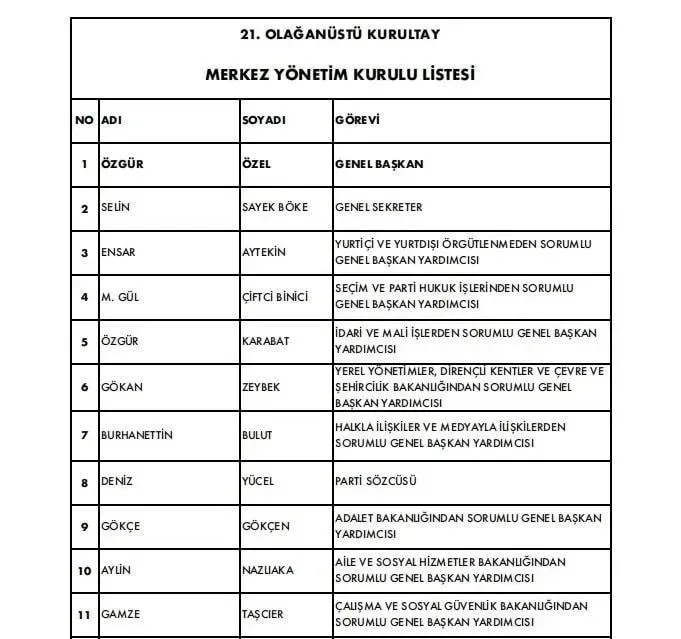 Şaibeli kurultay iddialarının ardından "Kayyum" korkusuyla gerçekleştirilen olağanüstü kurultayda yeniden Genel Başkan seçilen Özgür Özel yeni A takımını belirdi. CHP Parti Meclisi (PM) toplantısında alınan kararla Merkez Yönetim Kurulu (MYK) üyeleri netleşti.