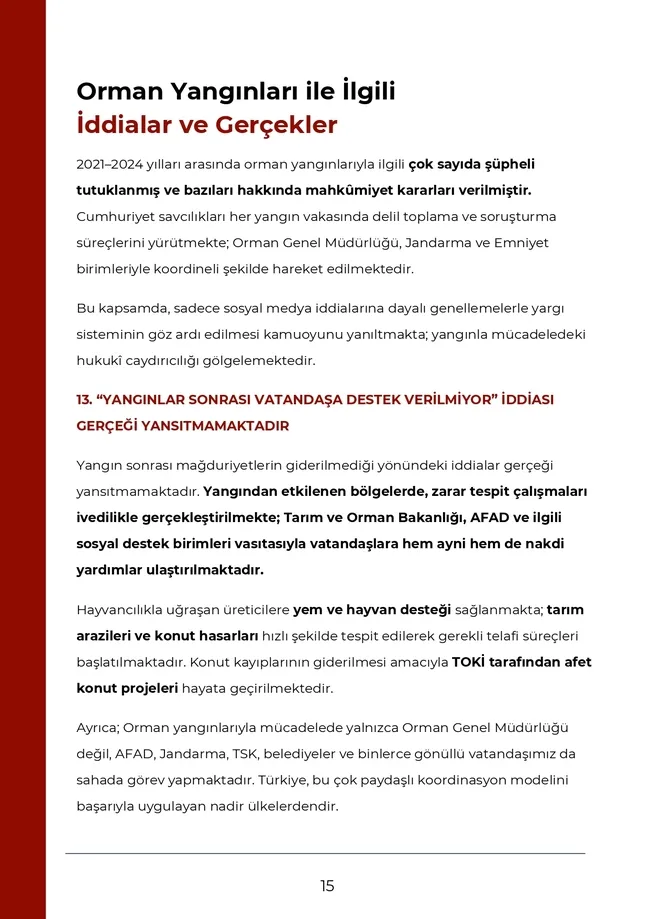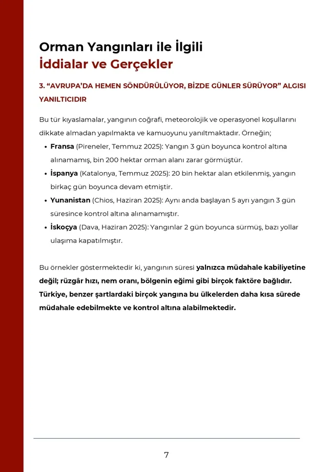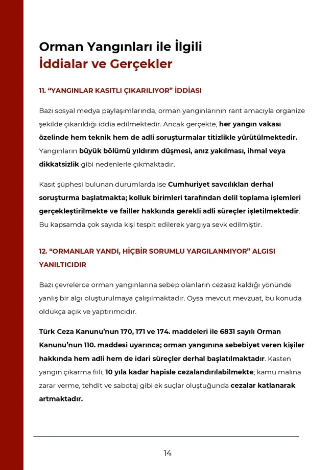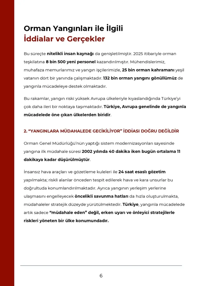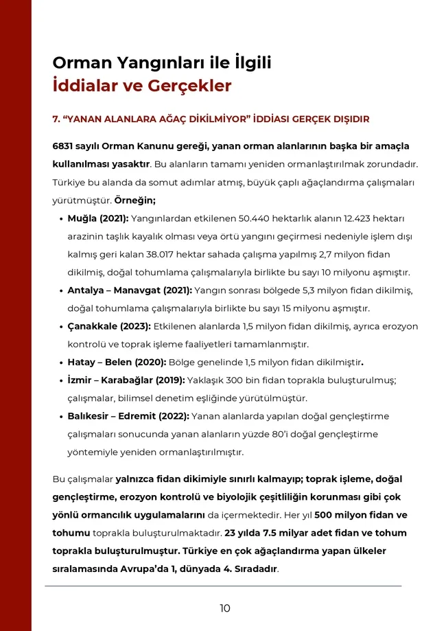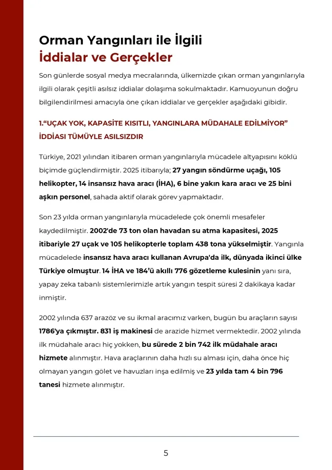 Son günlerde sosyal medya mecralarında orman yangınlarıyla ilgili çeşitli asılsız iddialar dolaşıma sokulurken, Dezenformasyonla Mücadele Merkezi (DMM), kamuoyunun doğru bilgilendirilmesi amacıyla kapsamlı bir bilgilendirme yayımladı. Bilgilendirmede, Türkiye’nin yangınlara karşı müdahale kapasitesinden yanan alanlara yönelik ağaçlandırma çalışmalarına kadar pek çok başlıkta dezenformasyon içerikli iddialar tek tek çürütüldü.