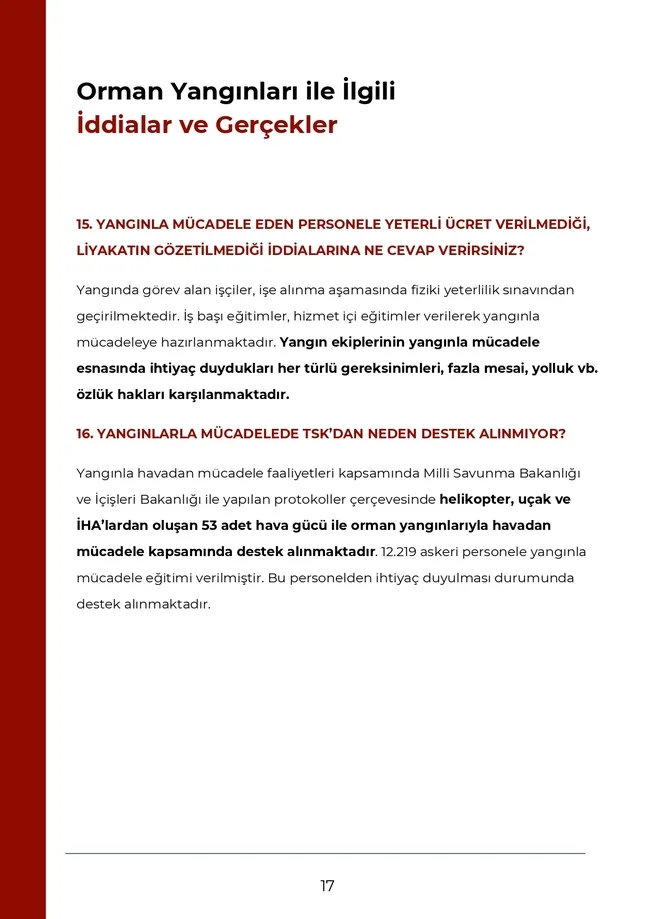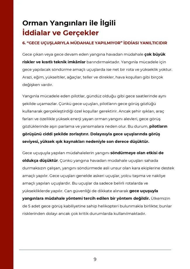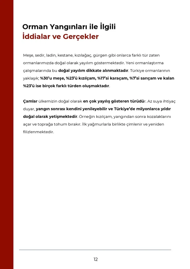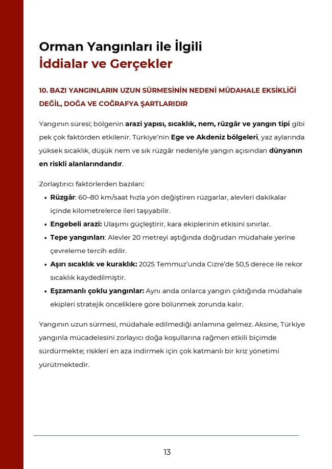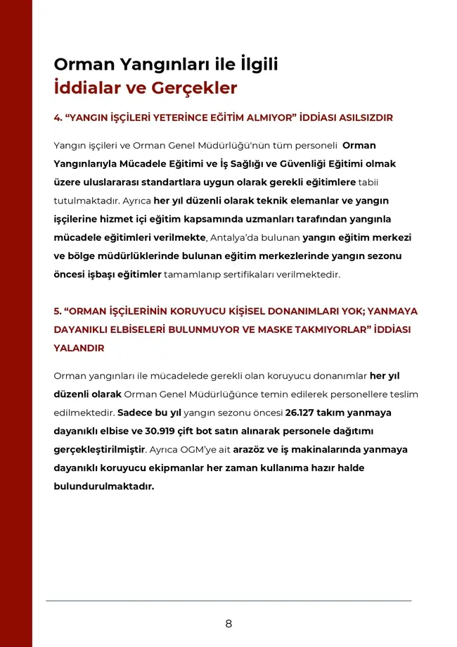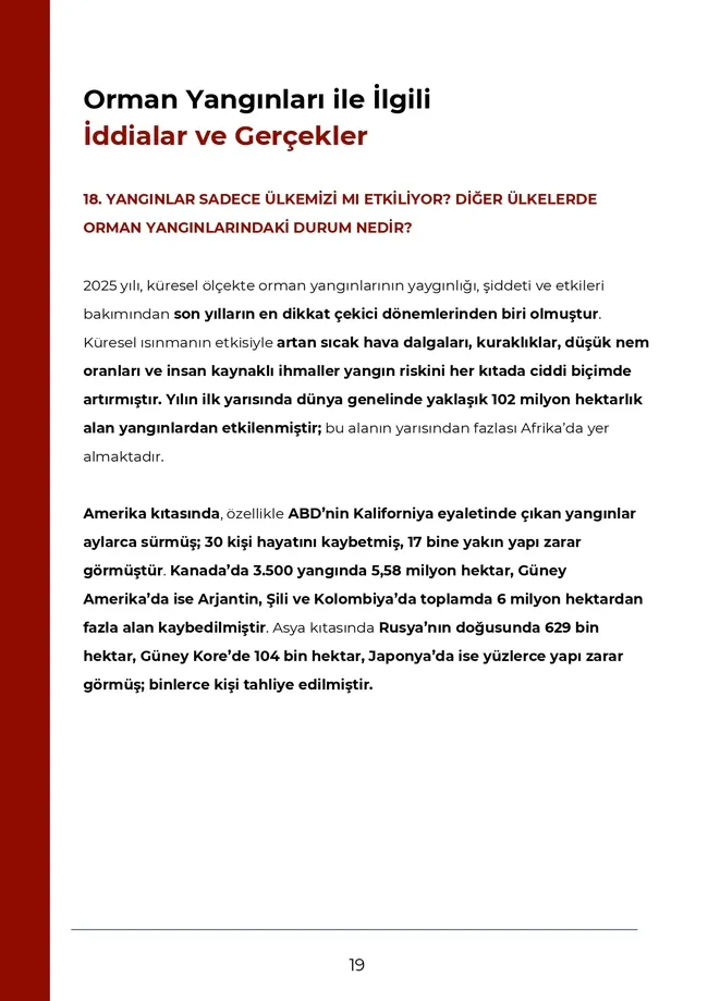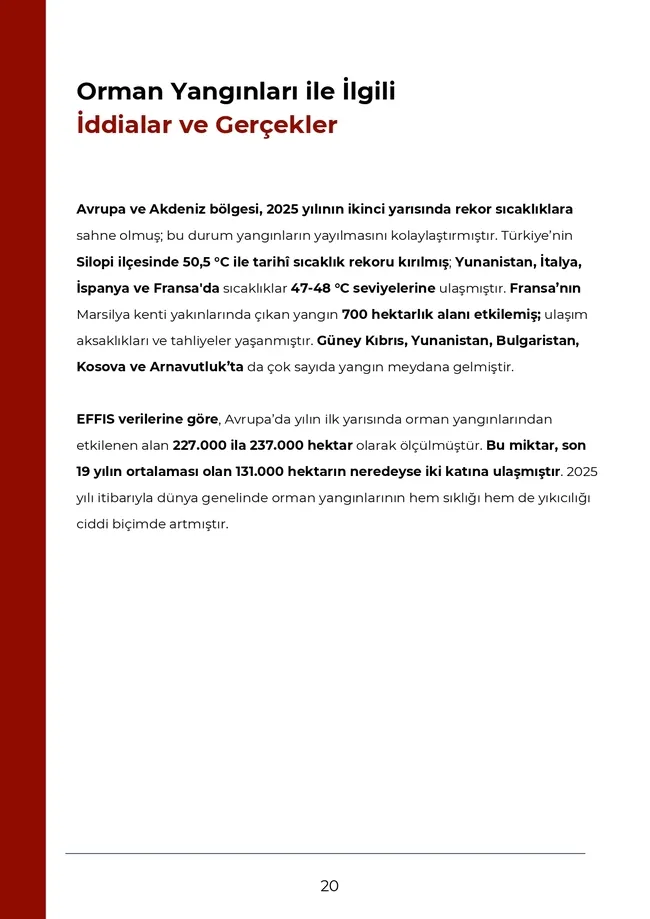 Son günlerde sosyal medya mecralarında orman yangınlarıyla ilgili çeşitli asılsız iddialar dolaşıma sokulurken, Dezenformasyonla Mücadele Merkezi (DMM), kamuoyunun doğru bilgilendirilmesi amacıyla kapsamlı bir bilgilendirme yayımladı. Bilgilendirmede, Türkiye’nin yangınlara karşı müdahale kapasitesinden yanan alanlara yönelik ağaçlandırma çalışmalarına kadar pek çok başlıkta dezenformasyon içerikli iddialar tek tek çürütüldü.
