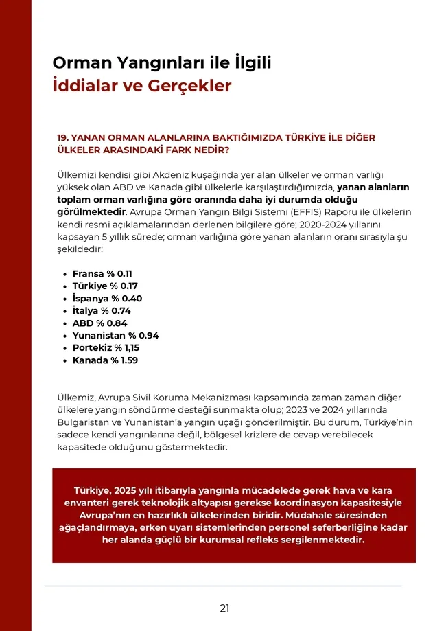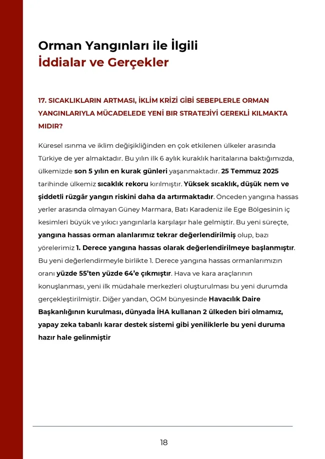 DMM tarafından yapılan bilgilendirmede, 2025 itibarıyla Türkiye'nin orman yangınlarıyla mücadelede 27 yangın söndürme uçağı, 105 helikopter, 14 insansız hava aracı (İHA), 6 bine yakın kara aracı ve 25 bini aşkın personelle Avrupa'nın en hazırlıklı ülkelerinden biri konumuna ulaştığı vurgulandı.