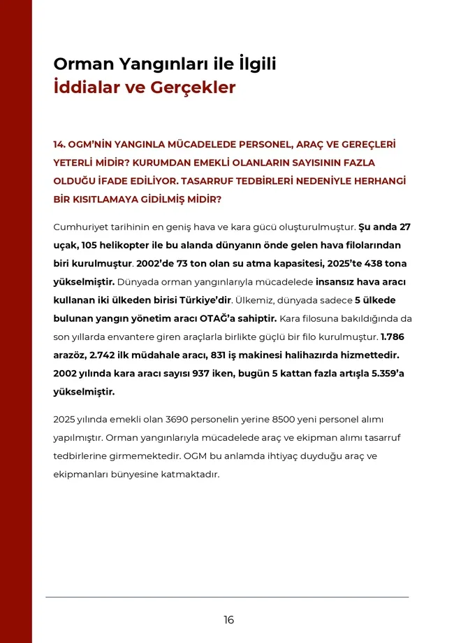 2002 yılında yalnızca 73 ton olan havadan su atma kapasitesinin bugün 438 tona çıktığı; aynı dönemde 637 olan kara aracı sayısının ise 5 kat artarak 5 bin 359'a ulaştığı belirtildi.