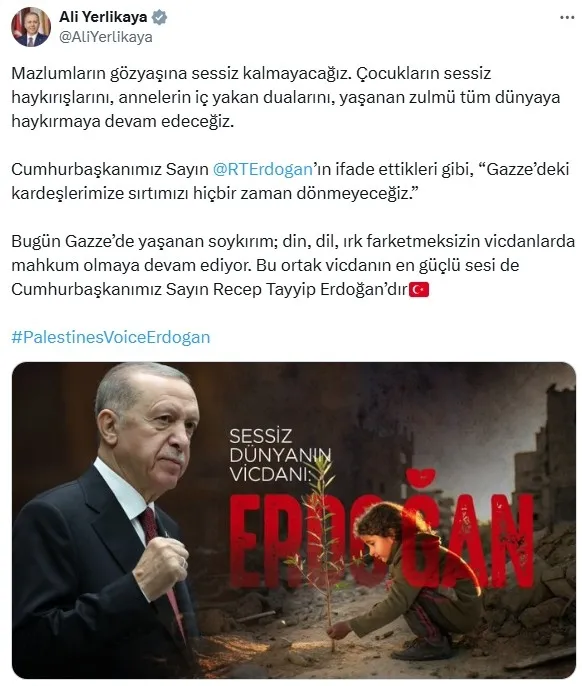 Başkan Recep Tayyip Erdoğan'ın BM kürsüsünde yapacağı açıklamalar öncesinde X plarformunda #PalestinesVoiceErdogan etiketi TT oldu. Cumhurbaşkanı Kabine üyelerinden peş peşe paylaşım geldi. Adalet Bakanı Yılmaz Tunç; "Cumhurbaşkanımız Sayın Recep Tayyip Erdoğan, sessiz dünyanın vicdanıdır. Filistin topraklarında yaşanan soykırıma karşı ortaya koyduğu kararlı ve cesur mücadeleden bir adım dahi geri atmayan Sayın Cumhurbaşkanımız, tüm dünyada adaletin, hakkın ve hakikatin sesi olmaktadır." ifadelerine yer verdi.
