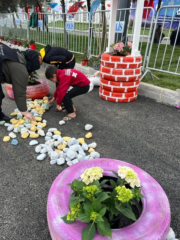Ümraniye Belediyesi Kadın ve Aile Müdürlüğü Geleneksel Akademi Üretim Atölye Şefi Sema Demiryuğuran konuyla ilgili yaptığı açıklamada, "Depremzede çocuklarımızın travma durumundan çıkmaları ve sosyal hayata daha kolay adapte olmalarını sağlamak için burada çocuklarımızla birlikte geri dönüşüme kazandırılan lastik ve varilleri boyuyoruz. Depremzede kardeşlerimizin asli ihtiyaçlarının dışında konteyner kenti yuva sıcaklığında hissetmeleri için bahçe peyzajı olarak 65 adet kullanılmış araba lastiği ve 6 adet varili geri dönüşüme kazandırdık. Belediyemizin kullanım dışı kalmış lastik ve varillerini, 15 kişilik ekip çalışmasıyla kullanılabilir bahçe peyzaj materyallerine dönüştürdük. Depremzede çocuklarımız da hayal güçlerini kullanarak birbirinden güzel çiçekleri, lastik saksılara diktiler. Umarım bu etkinlik çocuklarımıza daha iyi hissettirmiştir" dedi.