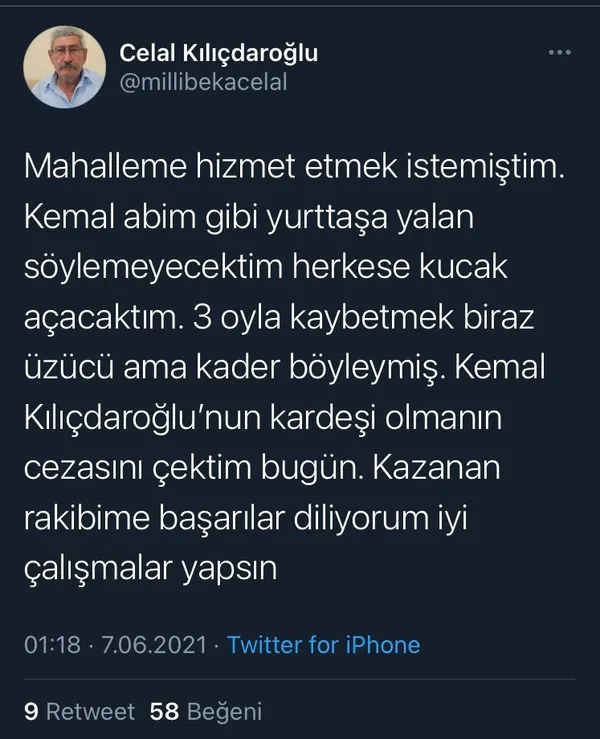 Celal Kılıçdaroğlu abisi Kemal Kılıçdaroğlu'na gönderme yaptığı başka bir tweetinde ise, "Bazı seçmenler 'Sen Kemal Bey'e benziyorsun. Sana oy vermeyiz' dediler. Benim ne kabahatim var. Ben ister miydim islam düşmanı Kemal Bey'in kardeşi olmayı. Kimse abisini seçemez kuzularım" şeklinde yazdı. Celal Kılıçdaroğlu, muhtarlık seçimiyle ilgili son tweetinde, "Mahalleme hizmet etmek istemiştim. Kemal abim gibi yurttaşa yalan söylemeyecektim. Herkese kucak açacaktım. 3 oyla kaybetmek biraz üzücü ama kader böyleymiş. Kemal Kılıçdaroğlu'nun kardeşi olmanın cezasını çektim bugün" diye yazdı.