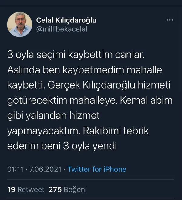 Celal Kılıçdaroğlu, muhtarlık seçiminden sonra Twitter hesabından paylaşımlar yaptı. Celal Kılıçdaroğlu attığı tweette, "3 oyla seçimi kaybettim canlar. Aslında ben kaybetmedim. Mahalle kaybetti. Gerçek Kılıçdaroğlu hizmeti götürecektim mahalleye. Kemal abim gibi yalandan hizmet yapmayacaktım. Rakibimi tebrik ederim. Beni 3 oyla yendi" dedi.