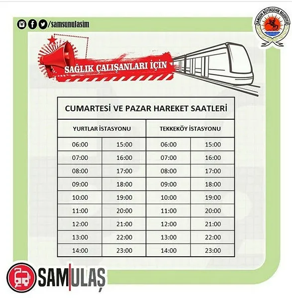 SAMULAŞ sosyal medya hesabından yaptığı açıklamada, "Korona virüs ile ilgili yeni alınan tedbirler kapsamında hafta sonu uygulanacak sokağa çıkma yasağında istisna kapsamındaki vatandaşlarımız için tramvaylarımız ile hizmetinizdeyiz" denildi.
