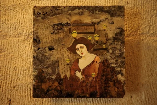Peri kızlarını taş üzerine resmeden Abalı, çalışmalarına Osmanlıca eski gazete kupürlerinden yazılar ekleyerek eserlerini daha da ilginç hale getiriyor.