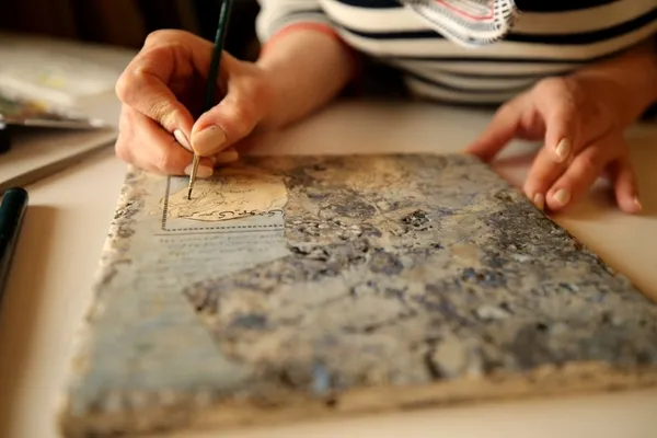 "Çalışmayı taşın dokusuna göre seçiyorum. Damarlı bir taş olduğu için kırılabiliyor, bunun için dikkatle çalışmam gerekiyor. Taşın dokusu hayalimde çeşitli öğeler canlandırıyor, ben de taşın bu dokusuna uygun çizim yapıyorum. Bölgeye has taşlar kullanıyorum. Bunlar, doku itibarıyla yaptığım çalışmalara zemin hazırlıyor. İllüstrasyon çalışmasıyla hikayelerin resimlerini yapıyorum. Resimleri, eski gazete kupürleri ile buluşturarak bütünlük katıyorum. Bölgenin mistik ve doğal bir havası var. Bu yüzden renkler ve kullandığım malzemeleri özellikle seçiyorum. Atölyeye gelen turistler çalışmalarımı çok beğeniyor ve enteresan buluyor."