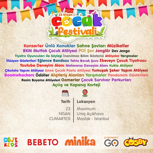 Dünyanın tek çocuk bayramı olan 23 Nisan'a özel, çocuklar için Teknovia İletişim tarafından özenle hazırlanmış 23 Nisan Çocuk Festivali'nde Ecrin su Çoban'ın konser ve söyleşisiyle, Güldür Güldür Oyuncularından Açelya Topaloğlu ve Burak Topaloğlu'nun ile Selena dizisinin Hades'i Sinan Çalışkanoğlu gerçekleşecek söyleşilerde çocuklarla buluşacak. minika'nın Medya Deneyim Alanı ile yer alacağı etkinlikte çocuklar bir dakikalığına YouTuber olacak ve çekilen videolar katılımcı çocuklarla paylaşılacak. Çocuklar ayrıca Maceracı Yüzgeçler'in sevilen karakterleri Biba ve Tuti ile de tanışma ve fotoğraf çektirme fırsatı yakalayacak.