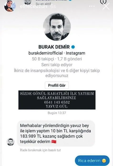 Elif Ece Uzun; "Benim ikizlerim var sosyal medya ile çok vakit geçiremiyorum. Bir ara bir link geldiğini ve tıkladığımı hatırlıyorum. Sonrasında hiçbir şeyden haberim yok. Hesabımı ele geçirmişler, arkadaşlarıma mesajlar atmışlar. Bir mankene benim adıma elimizde ifşa görüntülerin var paylaşmamızı istemiyorsan şu hesaba para aktar demişler. Kız ağlaya ağlaya beni aradı. Sanatçı arkadaşlarım, şarkıcılar her birine ayrı bir mesajla dolandırmaya çalışmışlar. Kimisi inanıp atmış kimi direkt numaramı bulup bana ulaştı" dedi.