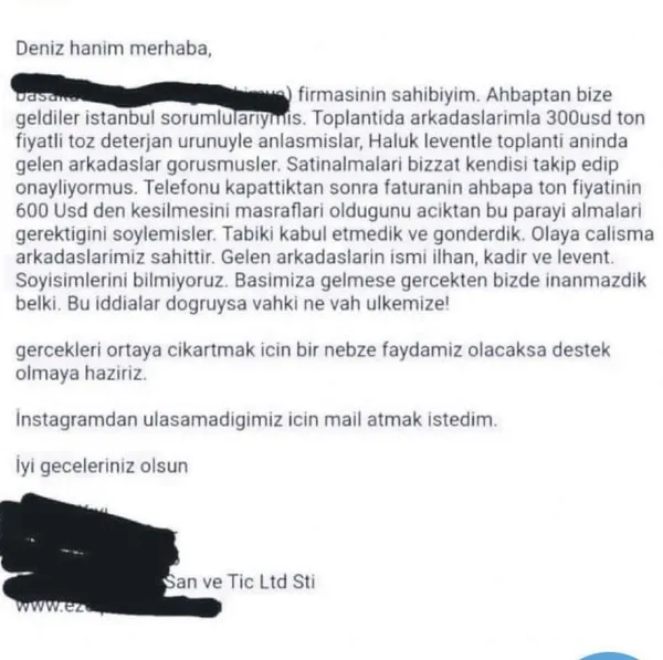 Toplantıda arkadaşlarımla 300 dolar ton fiyatlı toz deterjan ürünüyle anlaşmışlar, Haluk Levent'le görüşmüşler. Satın almaları bizzat kendisi takip edip onaylıyormuş. Telefonu kapattıktan sonra faturanın Ahbap'a ton fiyatının 600 dolardan kesilmesi gerektiğini, masrafları olduğunu, açıktan bu parayı almaları gerektiğini söylemişler. Tabii ki kabul etmedik ve gönderdik. Olaya çalışma arkadaşlarımız şahittir. Gelen arkadaşların ismi İlhan, Kadir ve Levent. Soy isimlerini bilmiyoruz. Başımıza gelmese biz de inanmazdık belki. Bu iddialar doğruysa vah ki ne vah ülkemize! Gerçekleri ortaya çıkarmak için bir nebze faydamız olacaksa destek olmaya hazırız."
