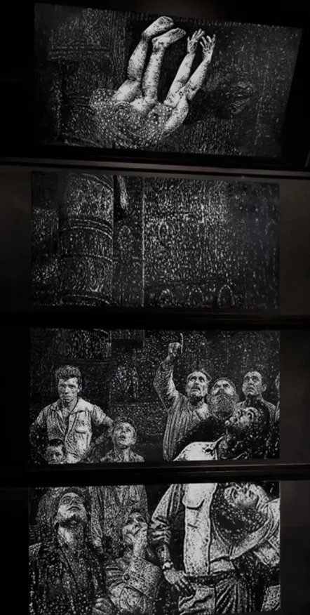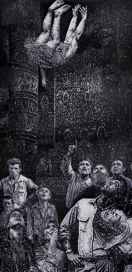 Rönesans gravürlerinde, Albrecht Dürer, Vasari gibi ressamların gravürlerinde izlenen ve zaman içinde klasik resim sanatında yerleşik kompozisyonları çağrıştıran bir görüntünün etkisidir, bu. Çağlar boyunca toplumlara yeryüzü gerçekleri ve gökyüzü düşleri arasındaki ilişkilerin, büyük anlatıların yarattığı metaforları yansıtan bir görüntünün etkisidir, bu. Resim, içerdiği düzen ve imgelerle üç aşamada bakmayı öneriyor. Resme alttan başlayarak bakıldığında bir grup insanın gökyüzüne doğru heyecanla ya da endişe ile baktığı, olağanüstü bir olaya tanık olduğu izleniyor. Bu bakış günümüzün beklenmedik olaylarında, savaş ve terör koşullarında hiç de yadırganamaz. İkinci aşamada bu bakışın sırrı açıklanıyor; bir kız çocuğu gökyüzünden aşağı doğru düşmektedir. Burada iki yorum geçerli olabilir: Çocuk, klasik resimlerde algılandığı gibi olası bir tanrının armağanıdır; ya da çocuk bir kaza, bir şiddet sonucu tehlikeli bir biçimde düşmektedir. Yerel ve küresel bağlamda "çocuk" olgusunda toplumların yaşadığı ikilemlerini düşününce bu imge de karşılığını buluyor. Bu anlatıya arka planda bir mekân kurgulanıyor; tarihsel geçmişi çağrıştıran sütunlu bir mimari, ki bu da klasik resimlerde var olan bir metafordur, burada bireysel ve toplumsal epistemolojideki "bellek" sorununa işaret ediyor.