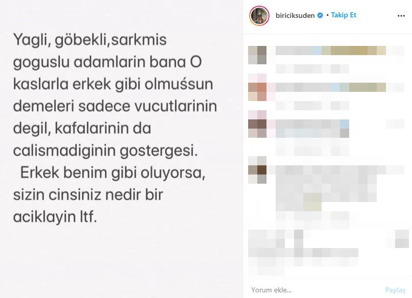 Erkeksi bir görüntüye sahip olduğu yönünde eleştirelere tepki gösteren Suden şunları yazdı: