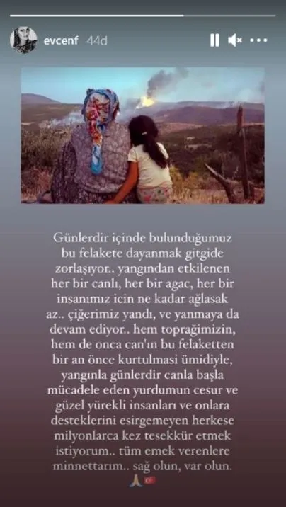 Oyuncu Fahriye Evcen, Türkiye'nin birçok yerinde gerçekleşen ve derin üzüntüye boğan orman yangınları ile ilgili bir paylaşımda bulundu. Afet bölgesinde görev alan herkese teşekkürde bulunan Evcen, paylaşımında şu ifadelere yer verdi:
