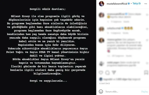 "Bütün aksaklıklar Sayın Bülent Ersoy'un yersiz kapris ve tutumundan kaynaklanmıştır. İleriki günlerde bir basın toplantısı yaparak bunlarla ilgili sizleri daha geniş bir çerçevede bilgilendireceğim."