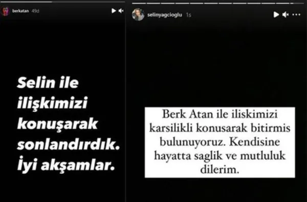Ancak çiftten geçtiğimiz hafta ayrılık haberi gelmişti. Berk Atan ve Selin Yağcıoğlu, sosyal medya hesaplarından yaptıkları açıklama ile aşklarını noktaladıklarını duyurmuştu.