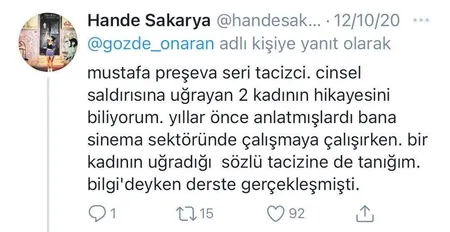 Oyuncu Sıla Çetindağ, attığı tweet'te 'Sevilen bir komedyenle film çekiyoruz, yalnız kaldığımızda 'Birazdan poponu çimdireceğim, ses çıkarma' dedi. Bunu kime nasıl ispatlarım kanıtçı kardeş' yazıyordu. Öte yandan kurgucu Mustafa Preşeva için "Onlarca kadını taciz etti, ben de onlardan biriyim" diyen kadının tweetleri yankı uyandırdı, ardından herkes Preşeva'yı ifşaya başladı.