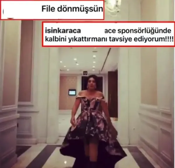 Karaca, geniş kesim etekli elbisesiyle yürüdüğü anları Instagram hesabından paylaştı. Bu gönderinin altı yorum dolarken, takipçilerinden biri "File dönmüşsün" dedi. Takipçisine sinirlenen Karaca ise, "Ace sponsorluğunda kalbini yıkattırmanı tavsiye ediyorum" diye yanıt verdi.
