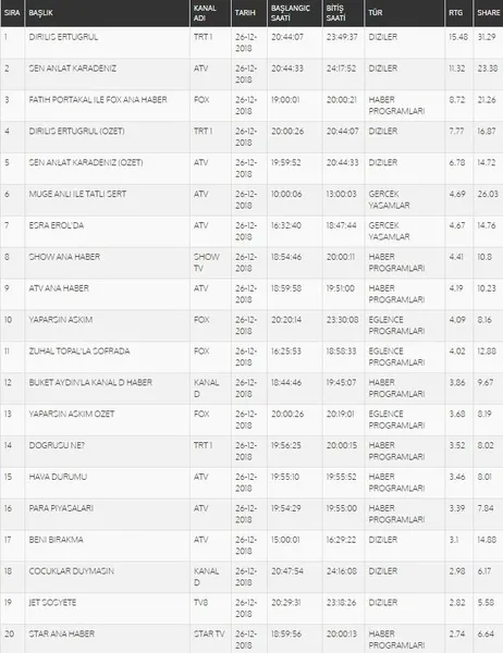 19 Aralık reyting sonuçlarında yine Çarşamba ekranlarının iki sevilen dizisinin kıyasıya mücadelesine tanık olmuştu. Haftayı birinci sırada kapatan dizi ise total puan türünde 31.95 share alan Diriliş Ertuğrul olmuştu. Hemen ardından ise 25.13 share alan Sen Anlat Karadeniz ikinci sırada yer almıştı.