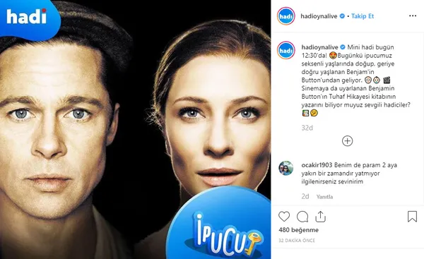Hadi'nin instagram hesabından yapılan paylaşımda, Mini hadi bugün 12:30'da! Bugünkü ipucumuz seksenli yaşlarında doğup, geriye doğru yaşlanan Benjam'in Button'undan geliyor. Sinemaya da uyarlanan Benjamin Button'ın Tuhaf Hikayesi kitabının yazarını biliyor muyuz sevgili hadiciler?