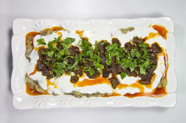 Ilık tabağın üzerine yoğurtlu patlıcanı, közlenmiş biberleri ve kıymalı harcı iyi bir şekilde yerleştirin ve son işlem olarak üzerine doğramış olduğunuz maydanozu ekleyerek sıcak olarak servis edebilirsiniz.