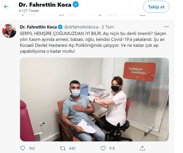 Sağlık Bakanı Fahrettin Koca, "Serpil hemşire çoğumuzdan iyi bilir. Aşı niçin bu denli önemli. Geçen yıl kasım ayında annesi, babası, oğlu ve kendisi Covid-19'a yakalandı. Şu an Kocaeli Devlet Hastanesi aşı polikliniğinde çalışıyor."