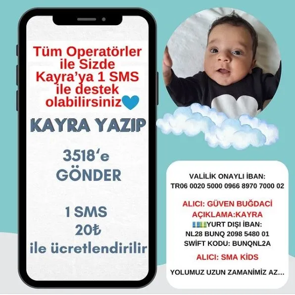 4 aylık olan ve doğduğunda SMA teşhisi alan Kayra Buğdacı, valilik onaylı kampanyasıyla herkesten destek bekliyor. Başlatılan kampanyanın kısa sürede %100'e ulaşmasıyla tedavisi gerçekleşecek olan Kayra bebek, sağlığına kavuşmuş olacak.