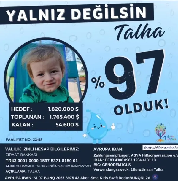 Adana'nın Ceyhan ilçesinde Spinal Musküler Atrofi (SMA) Tip 1 hastası 8 aylık Muhammed Talha Zengin'in tamamen iyileşebilmesi için yurt dışında Zolgensma Gen Tedavisi'ni görmesi gerekiyor. Çocuklarının tedavisi için 1 milyon 877 bin dolar gerektiğini ve zamanlarının giderek daraldığını dile getiren Zengin çifti, başlattıkları kampanyaya büyük, küçük demeden herkesin destek vermesini istiyor.