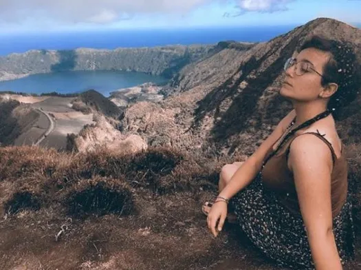 Sena Sonat, Sao Miguel adasının etkileyici manzarasıyla poz veriyor.