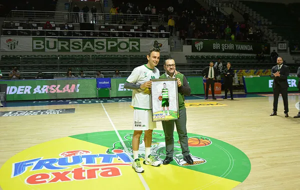 Frutti Extra Bursaspor tarafından kendisine, plaket, imzalı forma ve çivi sanatından kendinin fotoğrafı hediye edildi. Kendisine bugüne kadar yaptıkları için 1250'den fazla teşekkür, bundan sonrasında yapacakları için 3000'den fazla başarı dileyen Frutti Extra Bursaspor, parkenin bir daha böyle arslanı ender göreceğini açıkladı.