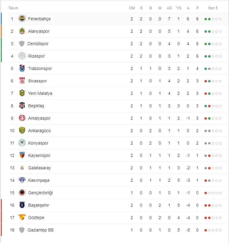 Süper Lig'in ikinci haftasında oluşan puan durumu şöyle: