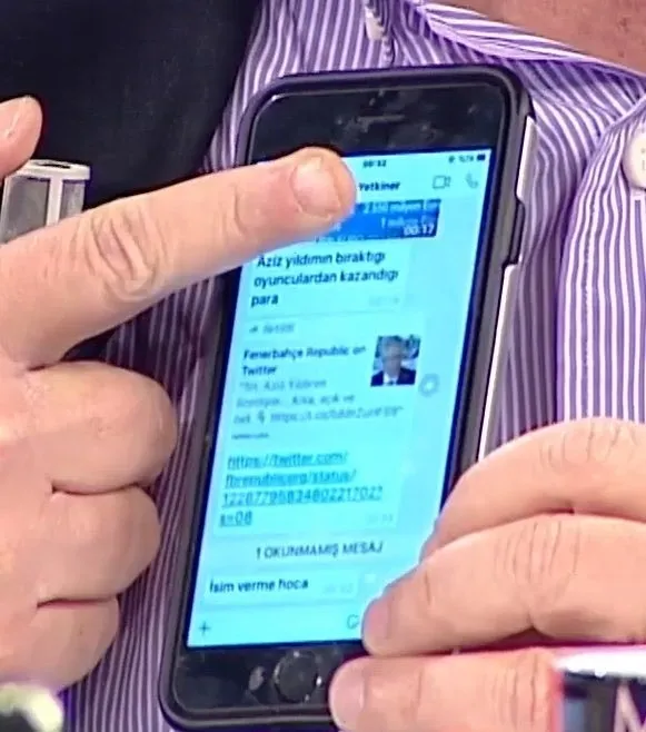 Üst tarafta yazan "Aziz Yıldırım'ın bıraktığı oyunculardan kazandığı para" mesajı dikkat çekerken, Müjdat Yetkiner'in ünlü yorumcudan isminin verilmemesini istediği mesaj ortalığı karıştırdı.