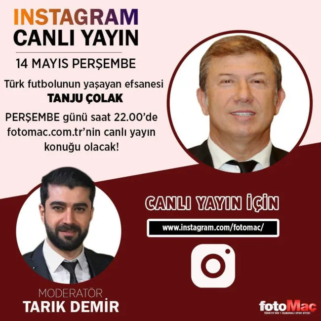 Bu kapsamda Türk futbolunun "Avrupa Gol Kralı" unvanlı efsane golcüsü Tanju Çolak, fotomac.com.tr Instagram canlı yayınına konuk olacak. Çolak, Tarık Demir moderatörlüğünde 14 Mayıs saat 22.00'de soruları yanıtlayacak. 56 yaşındaki Türk futbol efsanesine, canlı yayını takip edenler de sorularını iletebilecek.