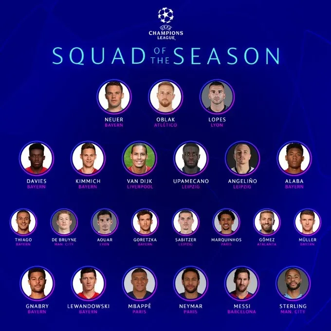 UEFA Şampiyonlar Ligi corona virüsünden dolayı verdiği zorunlu aradan, farklı bir formatla, Portekiz'de oynanan maçlarla başladı ve Bayern Münih'in şampiyonluğu ile son buldu. Devler Ligi'nde uzun aradan sonra Lionel Messi ve Cristiano Ronaldo'nun olmadığı yarı final ve final maçları oynandı. Bu sezon Cristiano Ronaldo'lu Juventus turnuvaya son 16 turunda veda ederken, Messi'li Barcelona ise çeyrek finalde şampiyon Bayern Münih'e karşı 8-2'lik yıllarca unutulmayacak bir mağlubiyet yaşadı. Sezonun sona ermesiyle UEFA, Şampiyonlar Ligi'nde bu sezonki performanslara göre yılın kadrosunu belirledi. Kadroda, Portekizli yıldız Cristiano Ronaldo yer almadı.