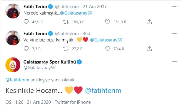 O meşhur tweet'in 3. yıl dönümünde atılan bu tweet de kısa sürede binlerce beğeniye ulaştı. Galatasaray resmi Twitter hesabı da Terim'e, "Kesinlikle Hocam" şeklinde cevap verdi.