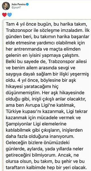 Trabzonspor'un tecrübeli sağ beki Joao Pereira, sosyal medya hesabı üzerinden bir paylaşım yaptı. Portekizli futbolcunun bu paylaşımı, Trabzonspor'a veda ediyor şeklinde yorumlandı. İşte Trabzonspor'un Portekizli sağ beki Pereira'nın o paylaşımı...