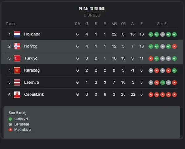 Ayyıldızlı millilerimizin 2022 Dünya Kupası elemeleri G grubu puan durumu tablosu bilgileri şöyle;