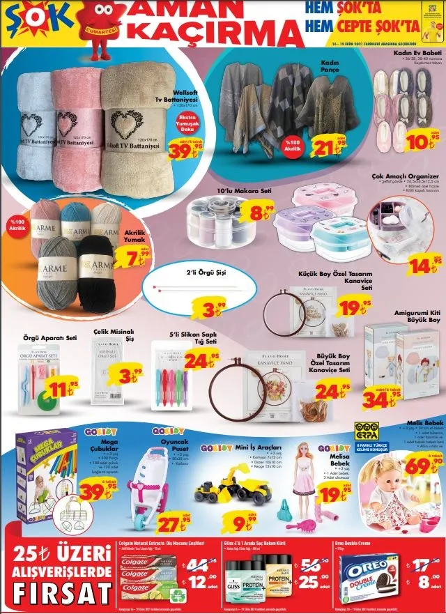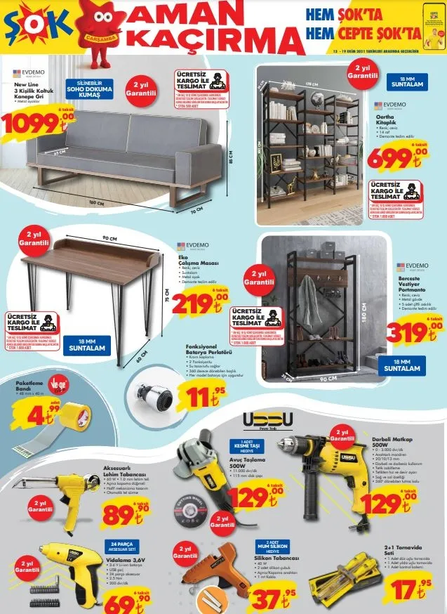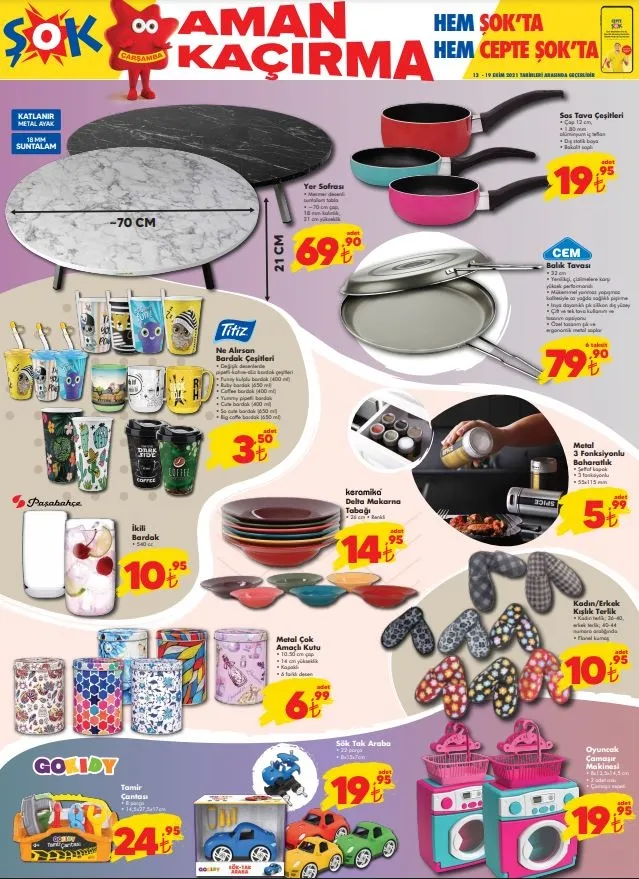 Bu hafta ŞOK marketlere gelecek olan indirimli ve aktüel ürünler 13-19 Ekim ŞOK aktüel ürünler listesi ile duyuruldu. Böylece marketlerin fırsatlarını takip eden vatandaşlar "ŞOK'ta bu hafta neler var, hangi ürünler indirimde?" sorusuna yanıt buldu. 16 Ekim ŞOK aktüel kataloğu ile bu hafta satışa sunulacak ürünler arasında dikiş nakış malzemeleri ve dikiş makinesi, oyuncak, mutfak gereçleri, yer sofrası gibi ürünler dikkat çekiyor. İşte bu hafta ŞOK'a gelecek ürünler!