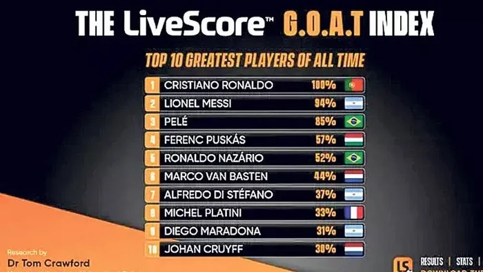 Buna göre gol ve asist sayısının etkisi, kazandığı turnuvaların büyüklüğü ve forma giydiği takımların çeşitliliğiyle Portekizli yıldız Cristiano Ronaldo, tarihin en iyi futbolcusu seçildi. Ronaldo, algoritmada yüzde 100 oranı bulan tek isim oldu. İkinci sırayı ise Arjantinli yıldız Lionel Messi aldı. Messi'nin oranı da yüzde 94 çıktı. 3. sırayı da Brezilya futbolunun efsanesi Pele, yüzde 85'lik başarı oranıyla kaptı. 4. sırada Macar Ferenc Puskas ve 5. sırada Brezilyalı Ronaldo yer aldı.