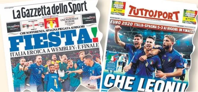 İtalyan medyası turnuva öncesinde temkinliydi ve şampiyonluk için Fransa, Almanya ve hatta Portekiz'den sonraya kendilerini yazıyorlardı. Bizi devirdikleri açılış maçında yakaladıkları hava, sayfalara, sponsor reklamlarına da yansıdı. Futbolcular milli marşı büyük coşkuyla okuyorlar, Mancini takımı topladığında çıkan görüntü, poster gibi sayfalara taşınıyordu. İspanya'nın oynadığı futbola şapka çıkardılar ama Mancini'nin takımının Çizme medyasına attırdığı manşetlerden mutluluk akıyordu. 2006 Dünya Kupası'nı kazandıklarının ertesi günü La Gazzetta "Her şey gerçek" manşeti atmış, 1.5 milyon satmıştı. Şimdi yine bir rüyadalar ve Wembley'deki finalden bakalım nasıl uyanacaklar?