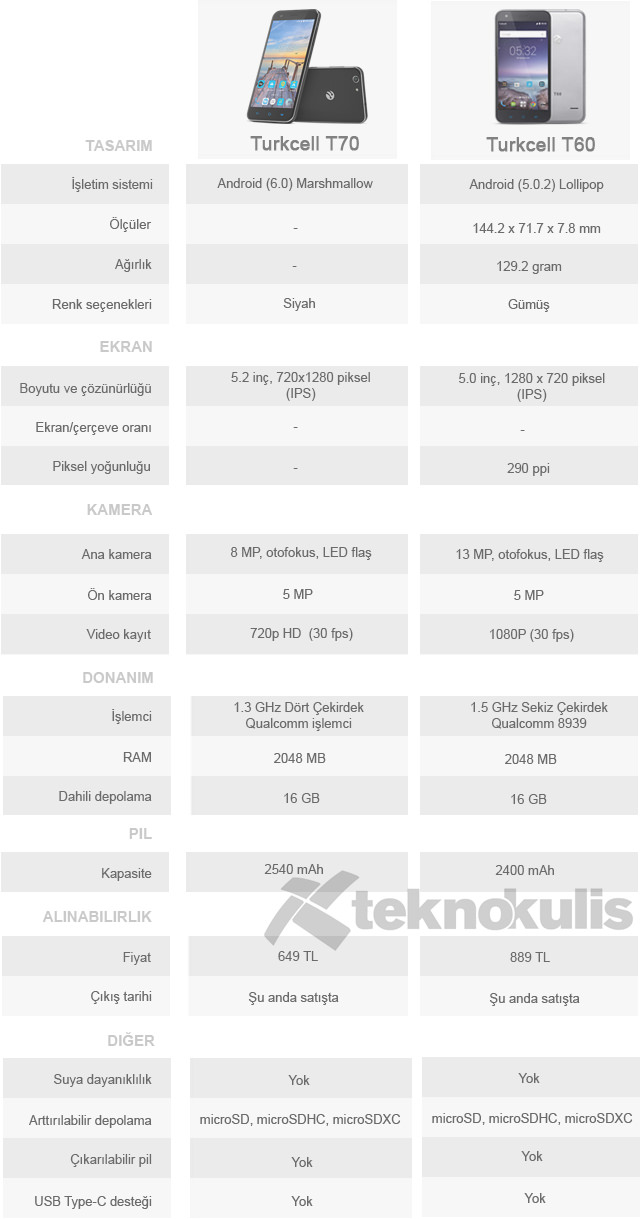 Turkcell T70 ve Turkcell T60 karşılaştırması